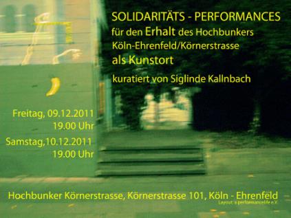 | Offene Atelier 2012 Siglinde Kallnbach: Fotografie, Projektkunst, Performance Jürgen Raap: Malerei "für Erika und Adi", unsere verstorbenen Mitstreiter | Fr. 14.09. 2012: 15 - 18.00 Uhr Sa. 15.09. 2012: 16 - 19.00 Uhr So 16.09.2012: 16 - 19.00 Uhr a performancelife e.V. Senefelderstr. 5, 50825 Köln |