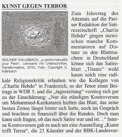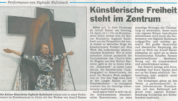 Um die Bewahrung der Freiheit in der der Kunst im politischen Klima nach dem Attentat auf die „Charlie hebdo“-Redaktion ging es bei einer Performance-Matinée im Kunstmuseum Ahlen: Die Zensur und vorauseilende Selbstzensur bei Karnevalsumzügen und in Ausstellungen bildete einen dramaturgischen roten Faden in der „Stückwerk“-Performance von Siglinde Kallnbach. Aus Anlass des 85. Geburtstags von Arnulf Rainer zeigte das Kunstmuseum Ahlen von dem Wiener Künstler Gemälde und Grafiken. Die Museumskuratorin Susanne Buckesfeld lud Siglinde Kallnbach zu einer „Hommage“-Performance an Rainer ein. Obwohl Arnulf Rainer sich der Gruppe der Wiener Aktionisten eigentlich nicht zugehörig fühlte und sich vom Tafelbild auch nicht so radikal abwandte wie etwa Otto Mühl und in den 1960er Jahren desgleichen Hermann Nitsch, so ist seine Malerei dennoch in großem Maße auch durch performative Elemente charakterisiert: da beide Künstler sich in ihren Arbeiten intensiv mit einem physisch-leiblichen Aspekt auseinandersetzen und beide auch den Atombombenabwurf von Hiroshima zum Thema ihrer Kunst machten, war es stimmig, gerade Kallnbach für einen solchen Performance-Beitrag auszuwählen. Verletzung und Verletzlichkeit, Versehrtheit nach einer Brustkrebsoperation, Bedrohung, Gewalt und Sexismus in der Gesellschaft, Angst, Befreiung und Überwindung bildeten einen Assoziationsrahmen, den Kallnbach mit einer beklemmenden atmosphärischen Dichte inszenierte. Sie nagelte ein weißes Kleid mit Beschriftungen in Kreuzform an die Wand (neben das „Kimonokreuz“ von Arnulf Rainer), verlas die Begründungen der Karnevalisten, warum diese nach dem Pariser Attentat bei den diesjährigen Umzügen keine „Je suis Charlie“-Statements sehen wollten, und Drohbriefe, die sie Anfang der 1990er Jahre selbst nachihren Performances und Installationen in Kassel erhalten hatte.