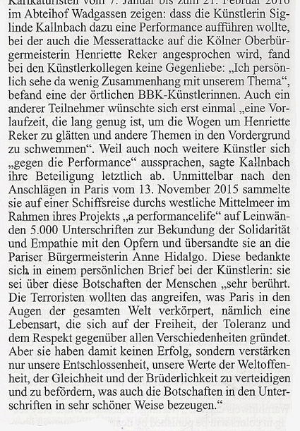 ... Unmittelbar nach den Anschlägen in Paris vom 13. November 2015 sammelte sie (Siglinde Kallnbach) auf einer Schiffsreise durchs westliche Mittelmeer im Rahmen ihres Projekts "a performancelife" auf Leinwänden 5 000 Unterschriften zur Bekundung der Solidarität und Empathie mit den Opfern und übersandte sie an die Pariser Bürgermeisterin Anne Hidalgo. Diese bedankte sich in einem persönlichen Brief bei der Künstlerin:sie sei über die Botschaften der Menschen "sehr berührt.Die Terroristen wollten das angreifen,was Paris in den Augen der ganzen Welt verkörpert, nämlich eine Lebensart, die sich auf der Freiheit, der Toleranz und dem Respekt gegenüber allen Verschiedenheiten gründet. Aber sie haben damit keinen Erfolg, sondern verstärken damit nur unsere Entschlossenheit, unsere Werte der Welt- offenheit, der Gleichheit und der Brüderlichkeit zu verteidigen und zu befördern, was auch die Botschaften in den Unterschriften in sehr schöner Weise bezeugen." KUNSTFORUM INTERNATIONAL, Bd. 238, Febr./März 2016