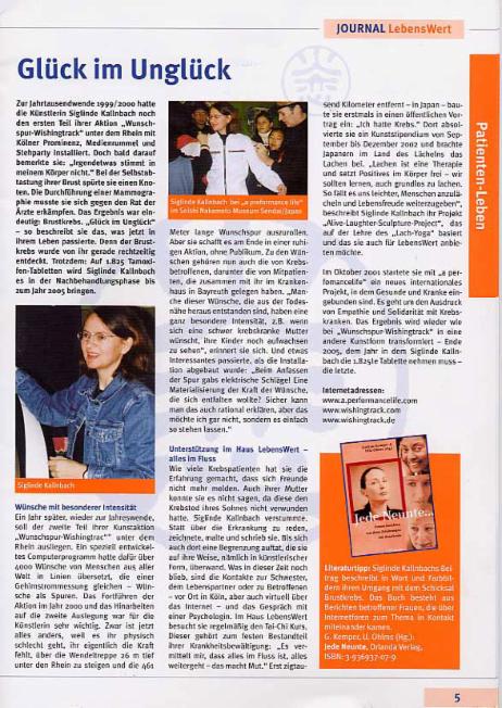 Im Mittelpunkt stand das Sammeln von Zeichnungen, Wünschen und Unterschriften von Menschen an unterschiedlichsten Orten in Japan, die zum großen Teil auf weißen Arbeitsanzügen verewigt wurden. Mit diesen Anzügen bewegte sich die Künstlerin selbst als eine lebendige und bewegte Wunschtafel zwischen den Leuten, indem sie die auf Gesundheit und Überleben bezogenen Gedanken und Vorstellungen sichtbar vor Augen führte, die in vielen Köpfe in der Regel versteckt vor sich gehen. Neben einem Dokumentationsvideo sind die Anzüge in der Siegburger Schau gleichermaßen in der Luft schwebend inszeniert, ähnlich wie das Wünschen selber eine schwebende Angelegenheit ist. Solange man wünscht, hält man das Leben in der Schwebe, sogar dann noch, wenn die Tatsachen des Lebens unumstößlich feststehen und das eigene Schicksal aufs Äußerste festgezurrt ist. Spannt sich nicht von dort ein kontinuierliches Band von der naiven Wunschgläubigkeit der Kindertage bis zum bisweilen utopischen, bisweilen verrückten Potential der Kunst, mit dem Erwachsene ihren Wünschen immer wieder auf die Sprünge helfen?