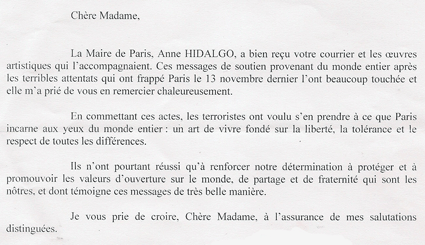 Jetzt bedankte sich die Bürgermeisterin Frau Hidalgo in einem persönlichen Brief bei der Künstlerin: sie sei über diese Botschaften der Menschen sehr berührt. Die Terroristen wollten das angreifen, was Paris in den Augen der gesamten Welt verkörpert, nämlich eine Lebensart, die sich auf der Freiheit, der Toleranz und dem Respekt gegenüber allen Verschiedenheiten gründet. Aber sie haben damit keinen Erfolg, sondern verstärken nur unsere Entschlossenheit, unsere Werte der Weltoffenheit, der Gleichheit und der Brüderlichkeit zu verteidigen und zu befördern, was auch die Botschaften in den Unterschriften in sehr schöner Weise bezeugen.